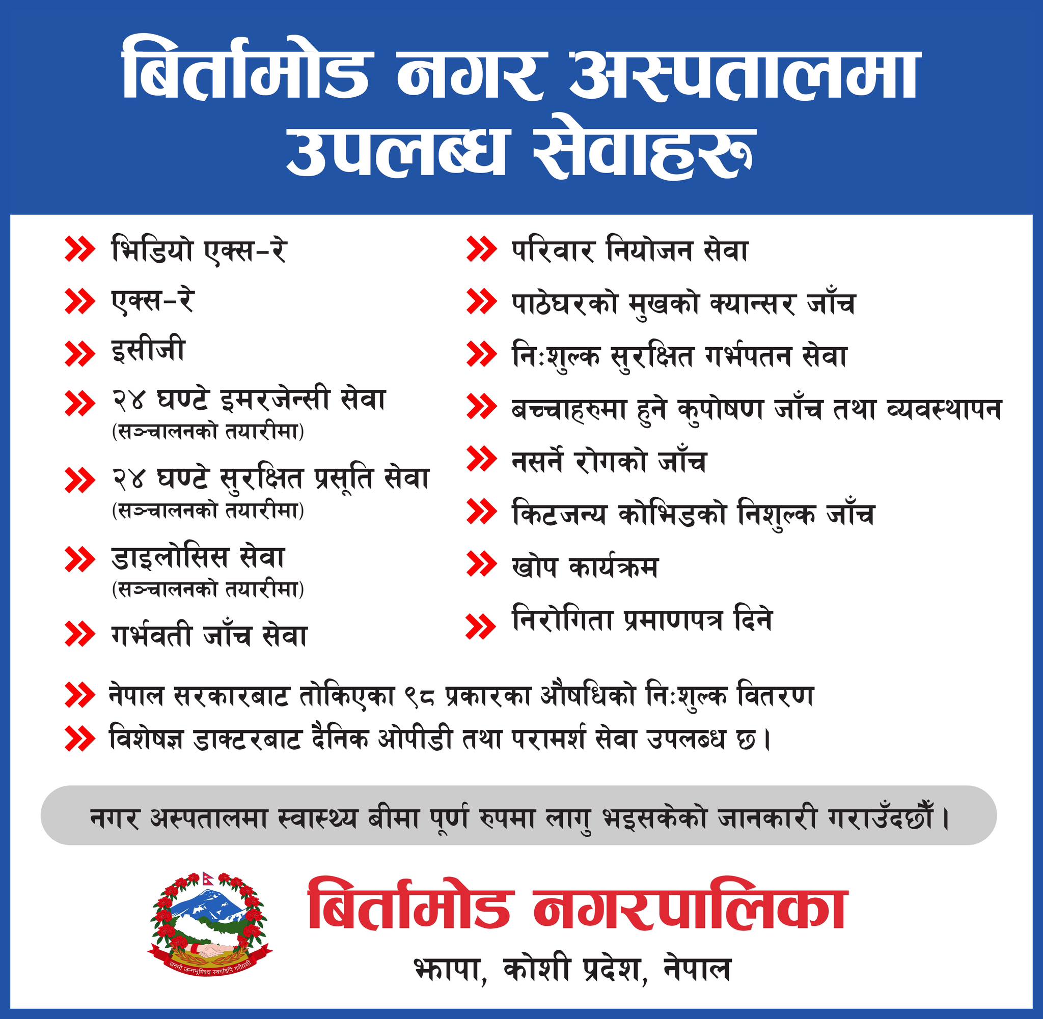 झापा । बिर्तामोड नगरपालिका वडा नम्बर १ ले विपन्न तथा आर्थिक अवस्था कमजोर भएका बिरामीहरुको लागि निशुल्क रगतको व्यवस्था गरेको छ ।