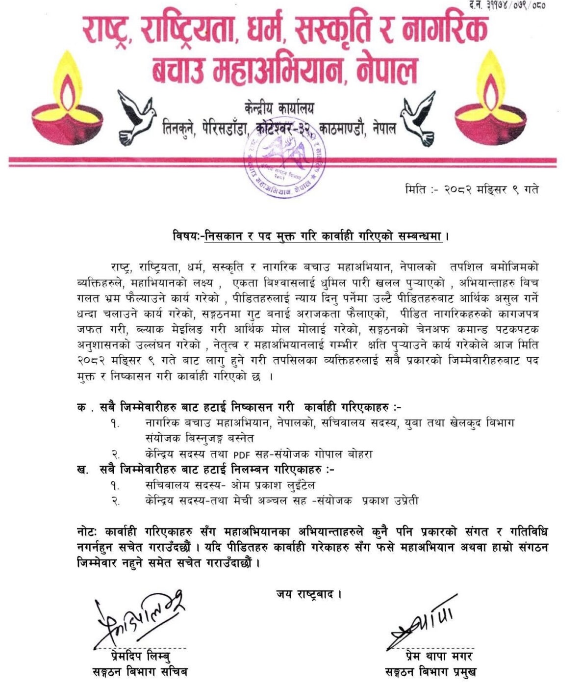 मंसिर ९ गतेदेखि लागू हुने गरी उनीहरूलाई पदमुक्त तथा निष्कासनको कारबाही गरिएको महाअभियानको संगठन विभागका सचिव प्रेमदिप लिम्बु र विभाग प्रमुख प्रेम थापा मगरले संयुक्त रूपमा जारी गरेको विज्ञप्तिमा उल्लेख छ।