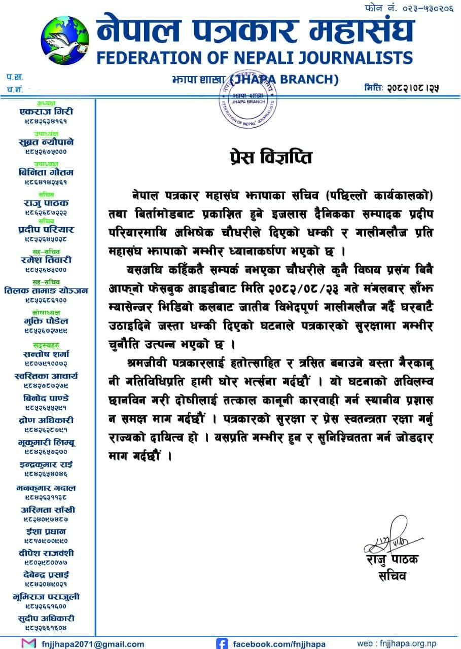 पत्रकारको सुरक्षा र प्रेस स्वतन्त्रता रक्षा गर्नु राज्यको दायित्व भएको र यसप्रति गम्भीर हुन नेपाल पत्रकार महासंघ झापाले जोडदार माग गरेको छ ।