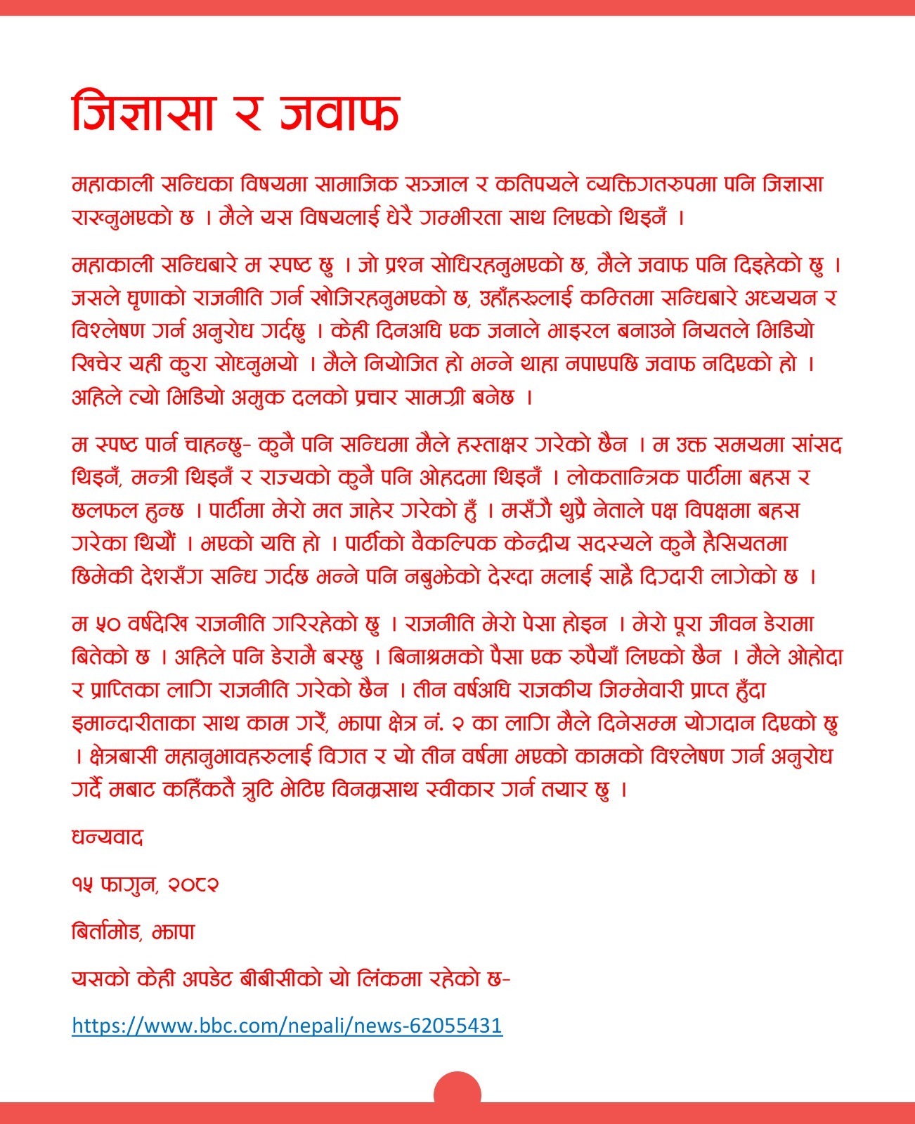 “कुनै पनि सन्धिमा मैले हस्ताक्षर गरेको छैन । त्यस समयमा म सांसद, मन्त्री वा राज्यको कुनै पनि जिम्मेवारीमा थिइनँ,” विज्ञप्तिमा घिमिरेले भन्नुभएको छ । आफूले लोकतान्त्रिक पार्टीभित्र भएको बहसमा व्यक्तिगत धारणा मात्रै राखेको र त्यसमा पक्ष–विपक्षमा धेरै नेताले विचार राखेको उहाँको भनाइ छ ।